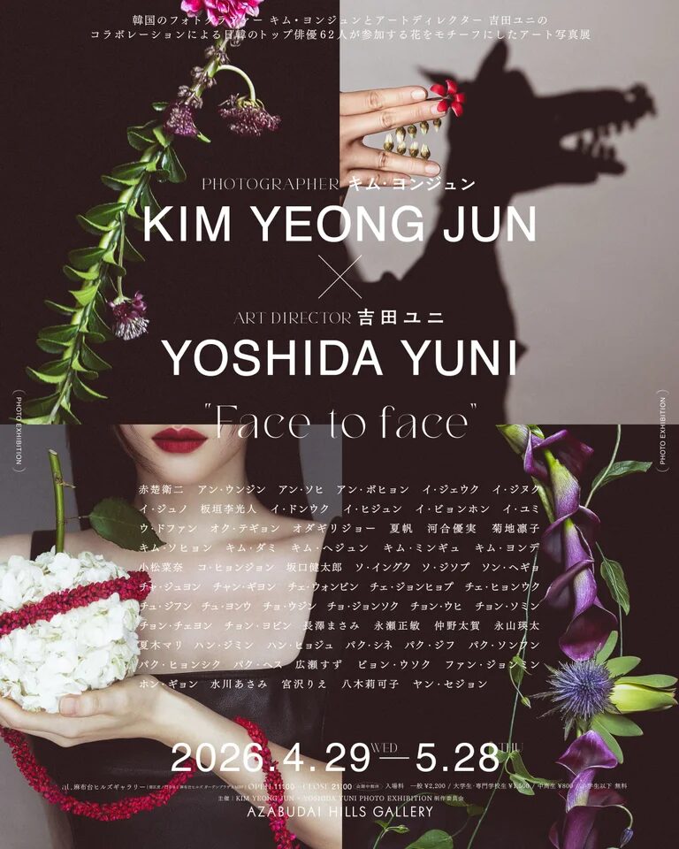 東京で4月〜5月に開催される写真展として、AZABUDAI HILLS GALLERYを会場に実施されるKIM YEONG JUN × YOSHIDA YUNI “Face to face”は、韓国のフォトグラファー キム・ヨンジュン と アートディレクター 吉田ユニ のコラボレーションによる日韓のトップ俳優62人が参加する花をモチーフにしたアート写真展です。